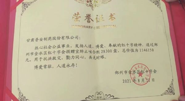 近期,國內多地相繼發生新冠疫情,疫情防控形勢非常嚴峻、復雜,而河南省多地又受到洪澇災害影響,洪澇災害后面臨著災情、疫情雙重挑戰。為履行社會責任,彰顯“一方有難,八方支援”的擔當,作為國有企業,甘肅藥業集團普安制藥會同中華中醫藥學會第一時間組織抗疫物資的捐贈(價值114.6萬元的藥品)供災后防疫使用,助力河南省做好災后疫情防控工作。