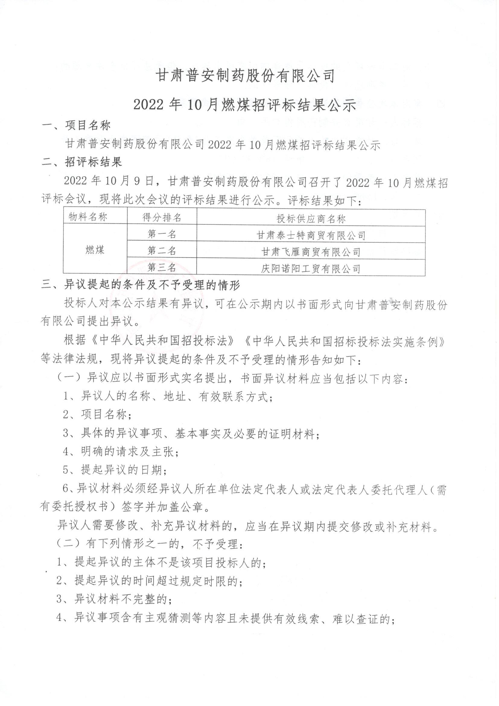 甘肅普安制藥股份有限公司2022年10月燃煤招評標結果的公示