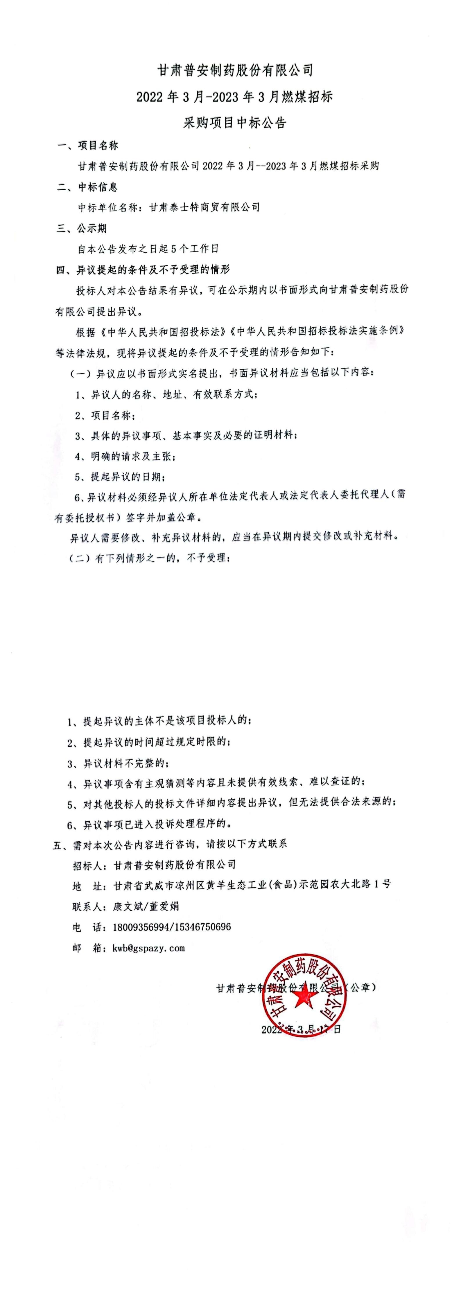 甘肅普安制藥股份有限公司2022年3月-2023年3月燃煤招標(biāo)采購(gòu)項(xiàng)目中標(biāo)公告