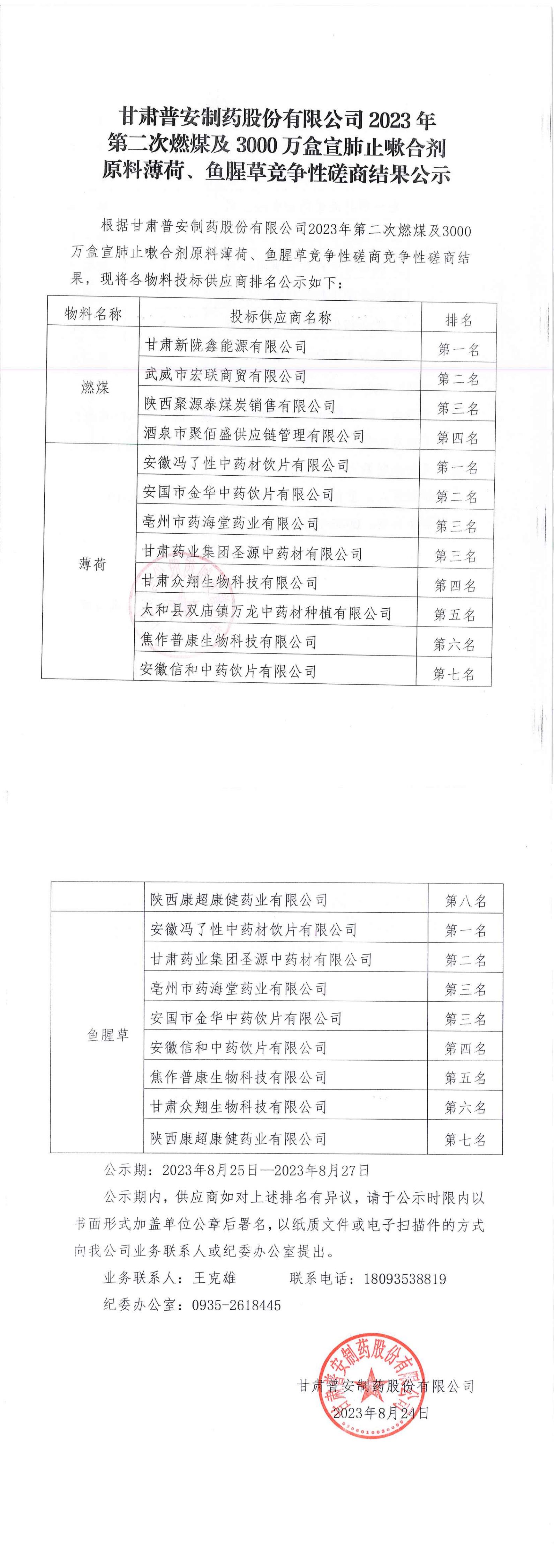 甘肅普安制藥股份有限公司2023年第二次燃煤及3000萬盒宣肺止嗽合劑原料薄荷、魚腥草競爭性磋商結果公示