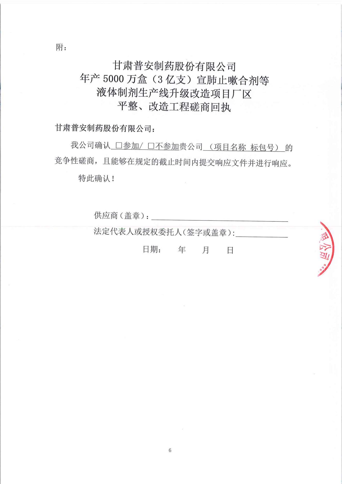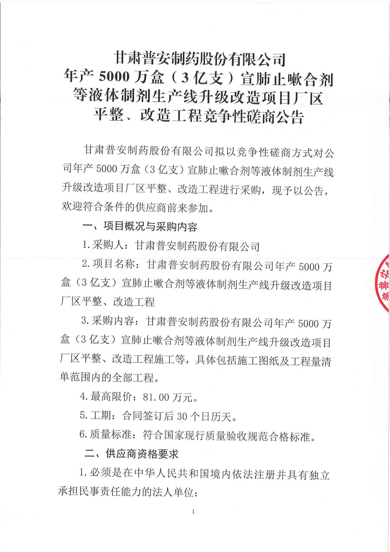 甘肅普安制藥股份有限公司年產(chǎn)5000萬盒(3億支)宣肺止嗽合劑等液體制劑生產(chǎn)線升級(jí)改造項(xiàng)目廠區(qū)平整、改造工程競(jìng)爭性磋商公告