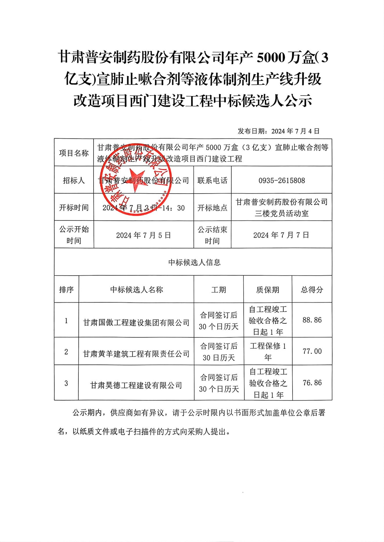 甘肅普安制藥股份有限公司年產5000萬盒(3億支)宣肺止嗽合劑等液體制劑生產線升級改造項目西門建設工程中標候選人公示