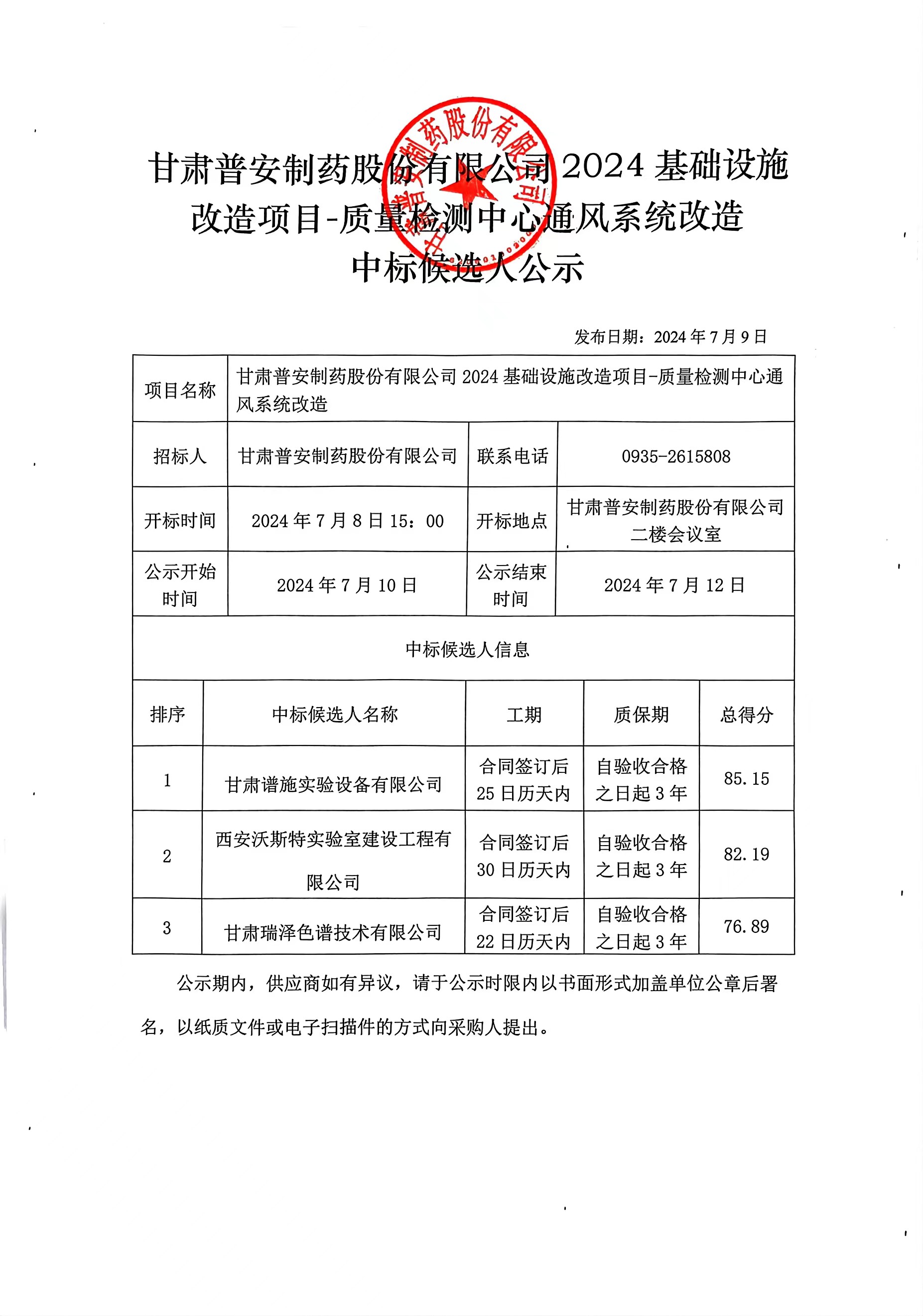 甘肅普安制藥股份有限公司2024年基礎(chǔ)設(shè)施改造項目-質(zhì)量檢測中心通風(fēng)系統(tǒng)改造中標候選人公示