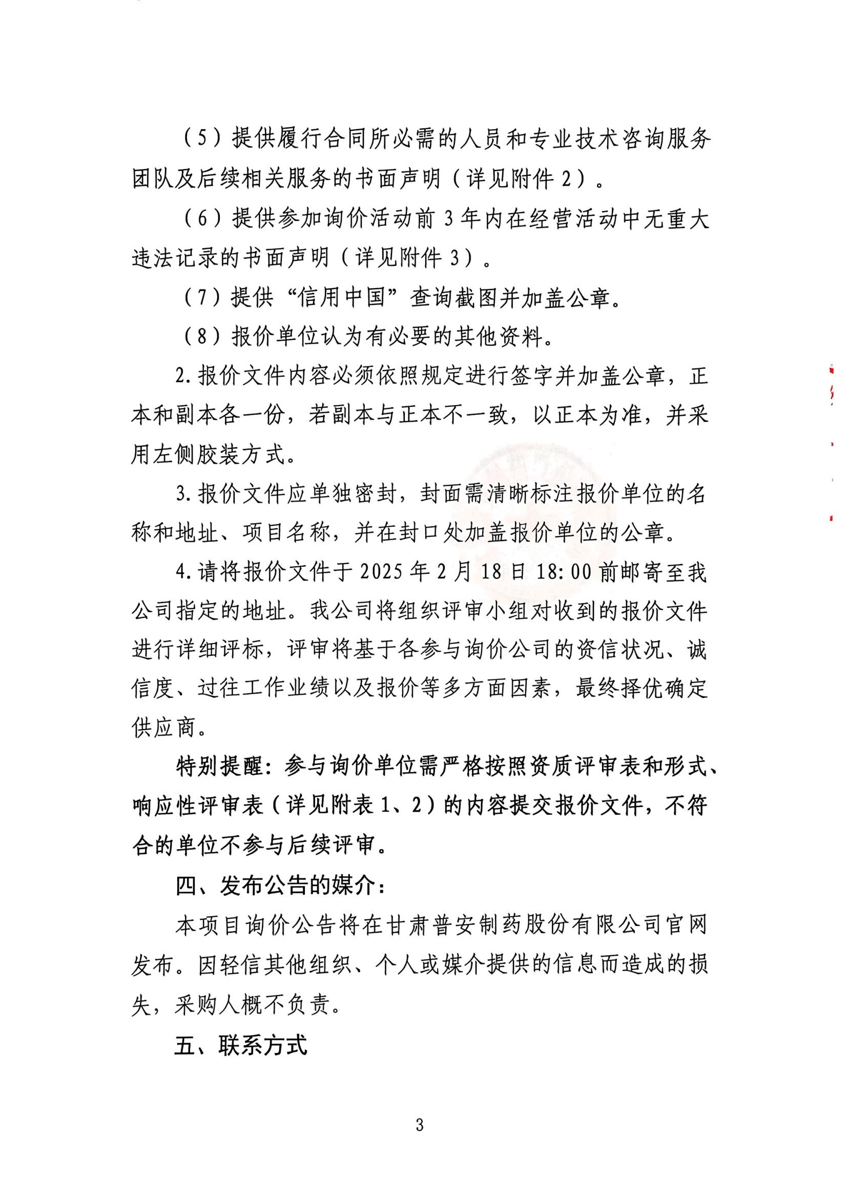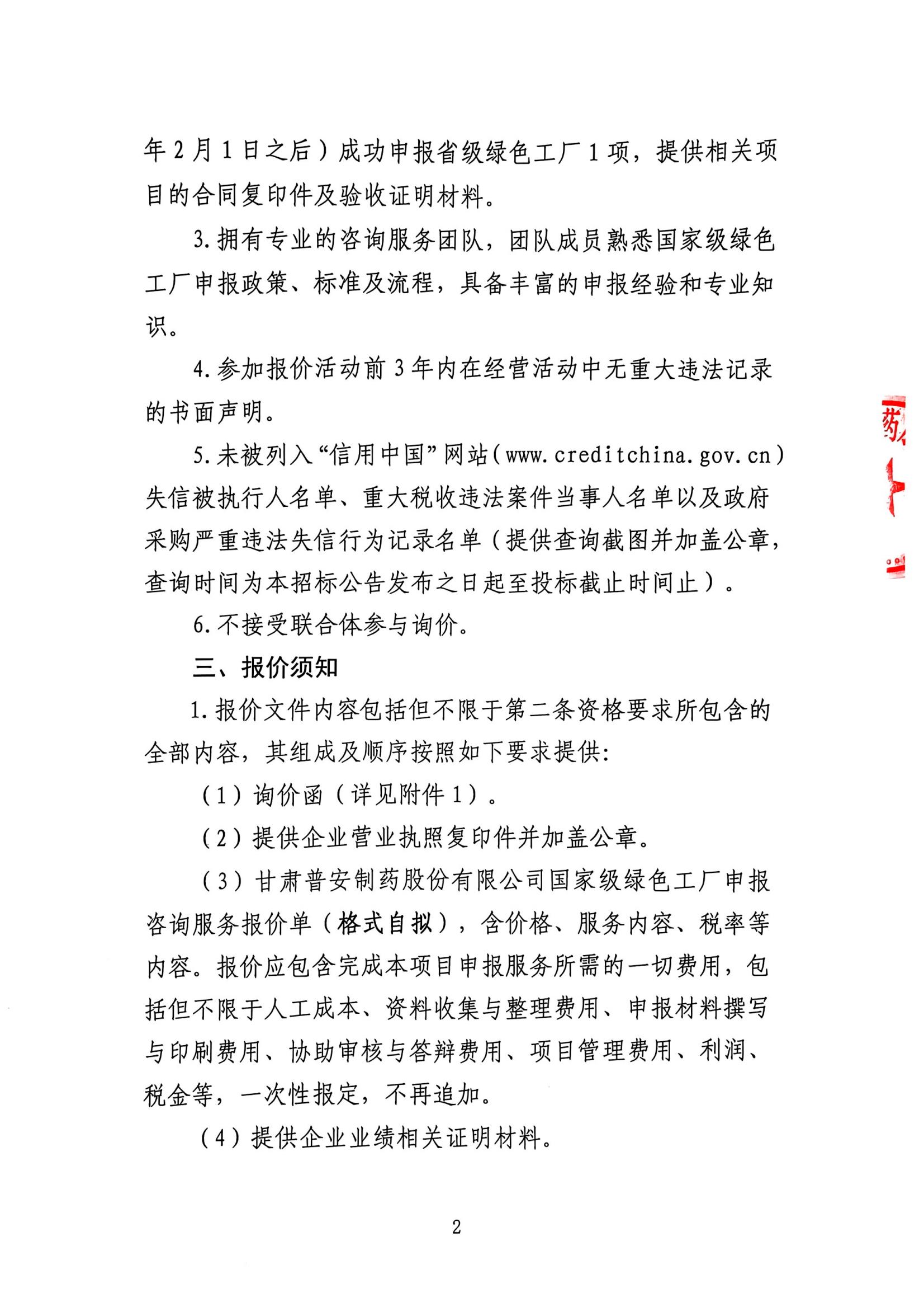 甘肅普安制藥股份有限公司國家級綠色工廠申報咨詢服務詢價公告